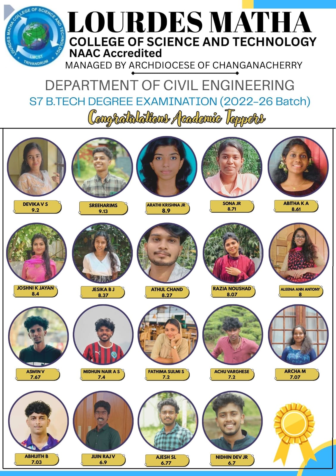 Civil Engineering Department of Lourdes Matha Collge of Science and Technology was started in 2013 with an intake of 60 students. The Department is enriched with a group senior faculty members who have years of experience in teaching, execution and industry. Our goal is to develop a group of young civil engineers who are capable of doing investigation and planning works, design and execution for all types of projects.Civil engineers are instrumental for building the great wonders of the world namely Taj Mahal, Pyramids, the Great Wall of China, Burj Khalifa in Dubai, Eiffel Tower etc.