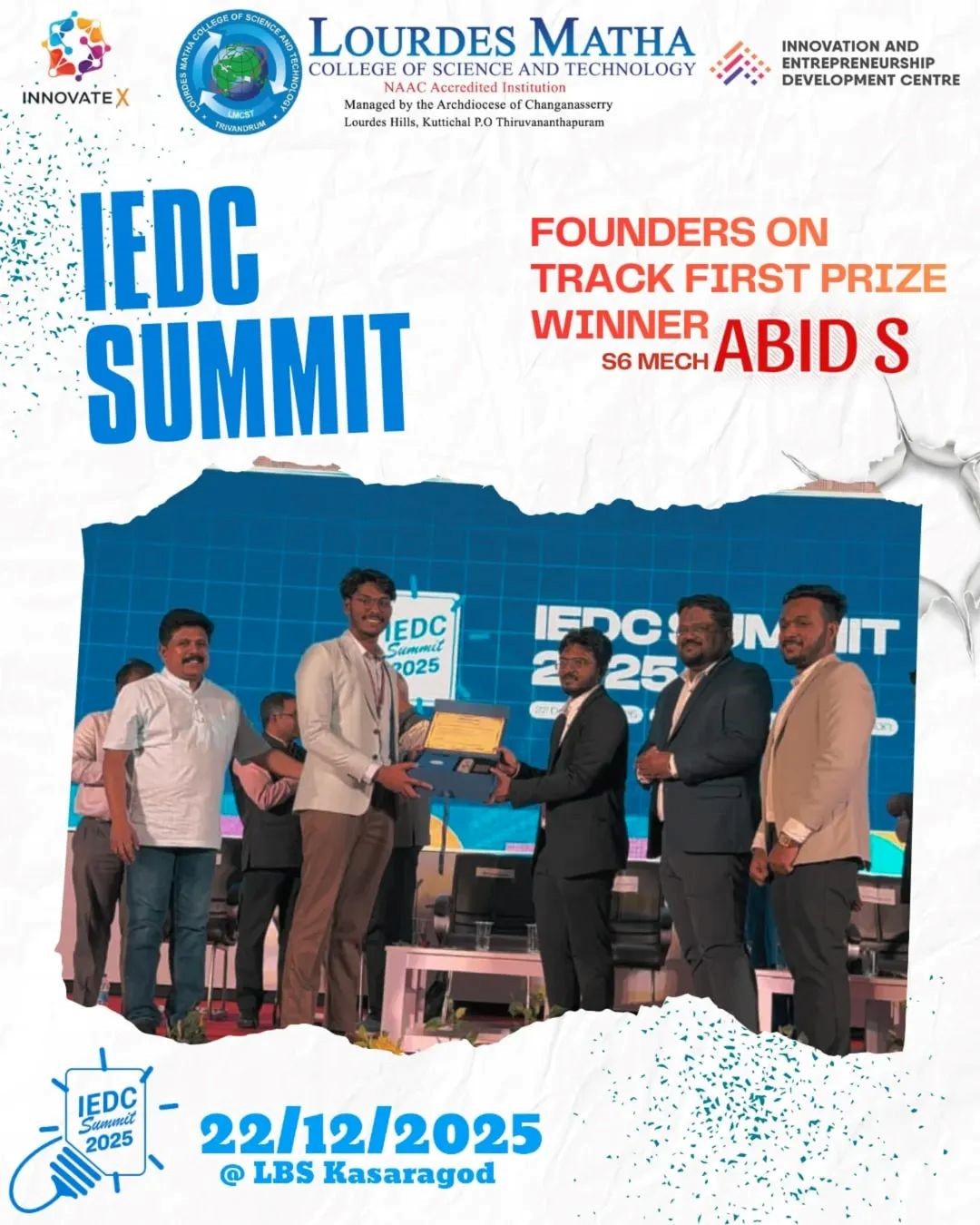 - Congratulations to Abid S, S6 Mechanical Engineering, for winning First Prize in “Founders on Track,” a program conducted by Startup Middle East in association with Kerala Startup Mission. He demonstrated exceptional skill in developing an innovative startup idea and convincingly presenting its potential impact on society. His achievement was recognized at the IEDC Summit held on 20-12-2025 at LBS College, Kasaragod