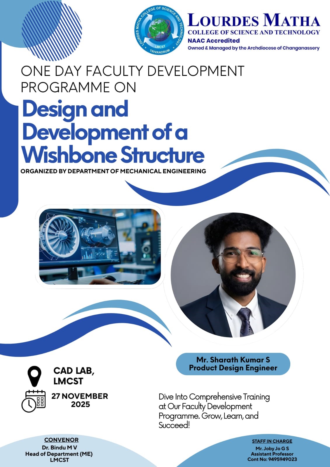 A one-day Faculty Development Programme on “Design and Development of a Wishbone Structure” was successfully conducted on 27 November 2025 at Lourdes Matha College of Science and Engineering (LMCST) for the Mechanical Engineering faculty.
