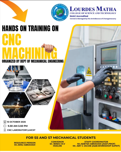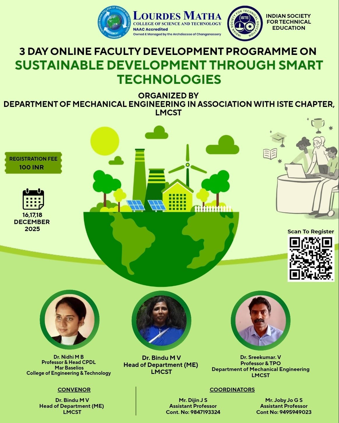 The Department of Mechanical Engineering, Lourdes Matha College of Science and Technology, successfully organized a three-day online Faculty Development Programme (FDP) on the theme “Sustainable Development through Smart Technologies” during December 16, 17, and 18.