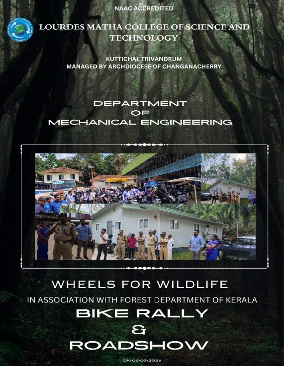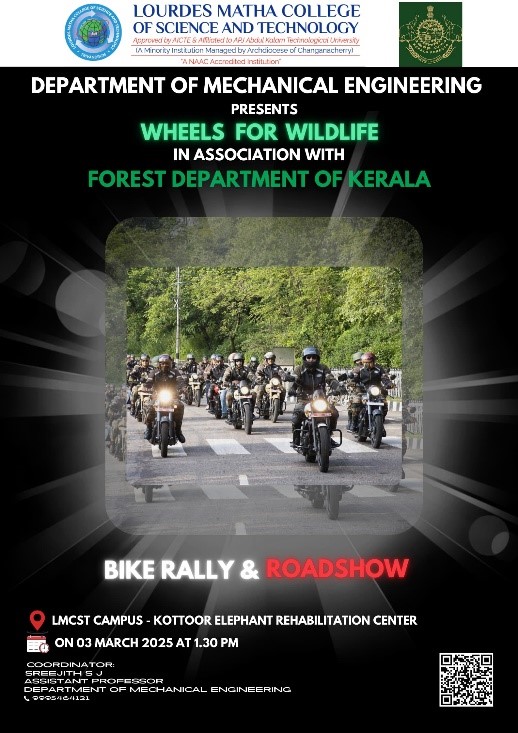 In celebration of World Wildlife Day 2025, Department of Mechanical Engineering is organizing a Bike Rally on March 3, 2025. The rally, organized by the in collaboration with other engineering departments, will start from the college campus in Kuttichal and end at the Kottoor Elephant Rehabilitation Centre, a key conservation center in Kerala.This event, in association with the Kerala Forest Department, aims to raise awareness about wildlife conservation, focusing on elephant protection, Prevention of wildfire. Participants, including students, faculty, and staff, will ride to promote sustainable environmental practices and the importance of wildlife protection.The rally will also feature informative sessions on elephant rehabilitation and wildlife conservation efforts, with interactions from Kerala Forest Department officials. This initiative encourages the younger generation to engage actively in protecting our natural heritage.