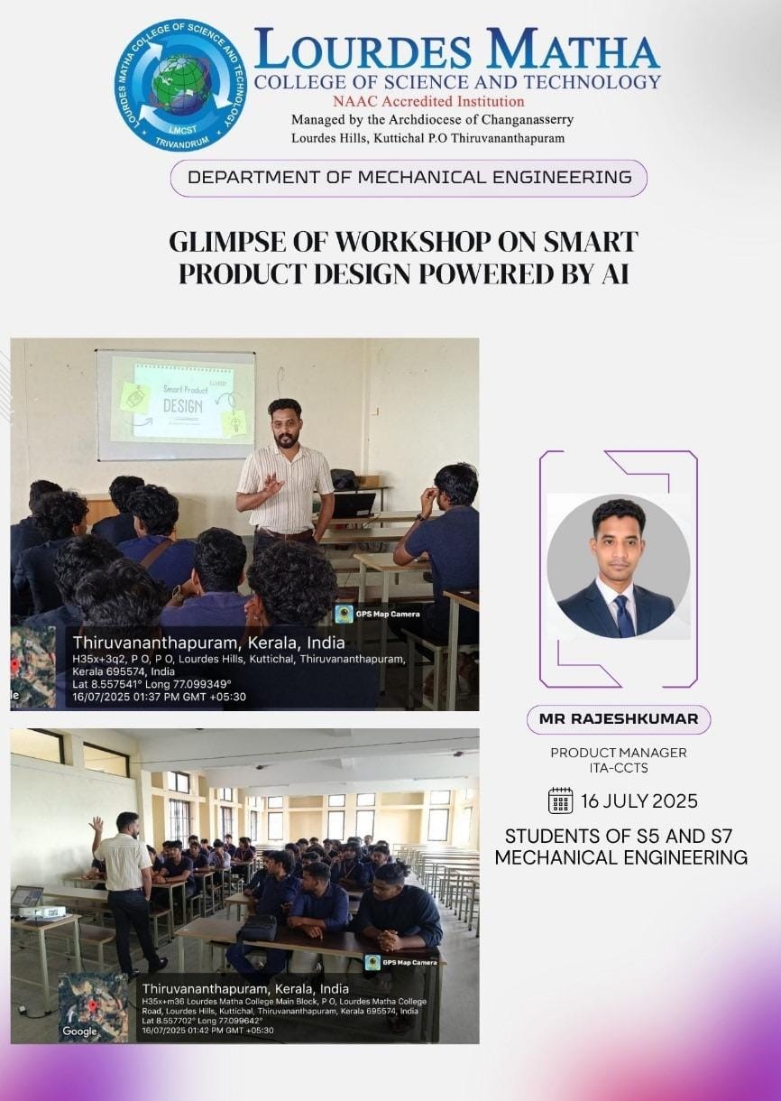 A one-day workshop on Smart Product Design Powered by AI was successfully conducted on 16th July 2025 at the LMCST campus, aimed at equipping students with futuristic insights and tools in product design enhanced by artificial intelligence. The participants included Mechanical Engineering students from the 5th and 7th semesters.