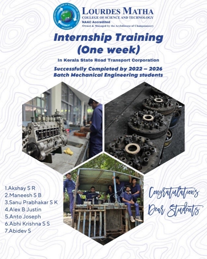 Seventh semester Mechanical Engineering students Akshay S.K., Manish S.B., SanjuPrabhakar S.K., Alex B. Justin, Anto Joseph, Abhi Krishna S.S., and Abhidev S. have successfully completed one-week internship training at the Kerala State Road Transport Corporation (KSRTC) in June 2025.
