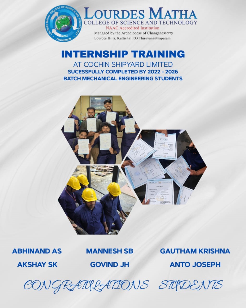 Akshay S.K., Manish S.B., Anto Joseph, Abhinand A S,GauthamKrishna,Govind J H have successfully completed one-week internship training at COCHIN SHIPYARD.