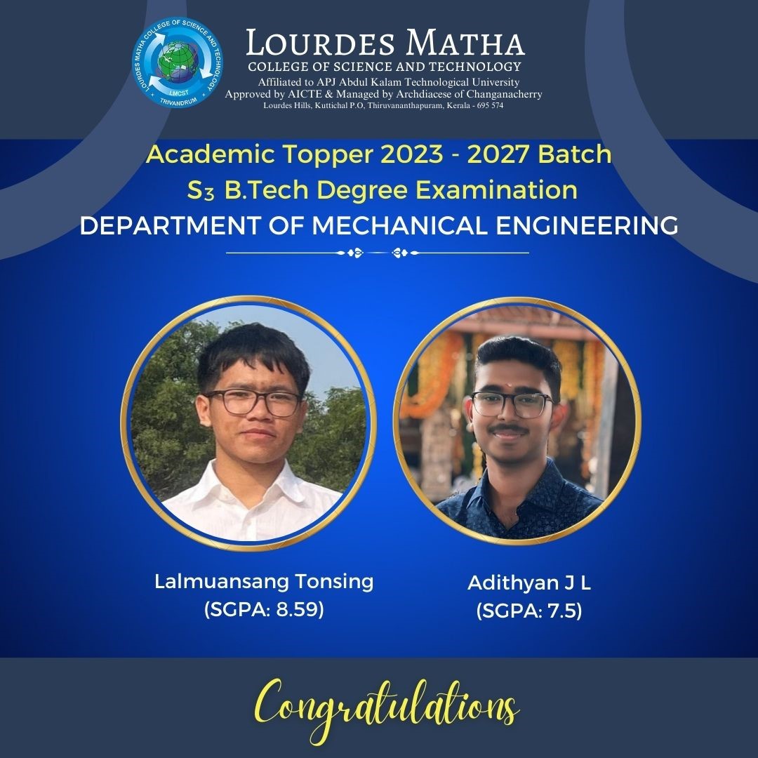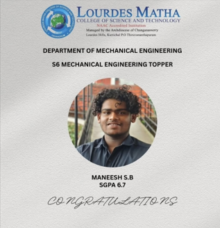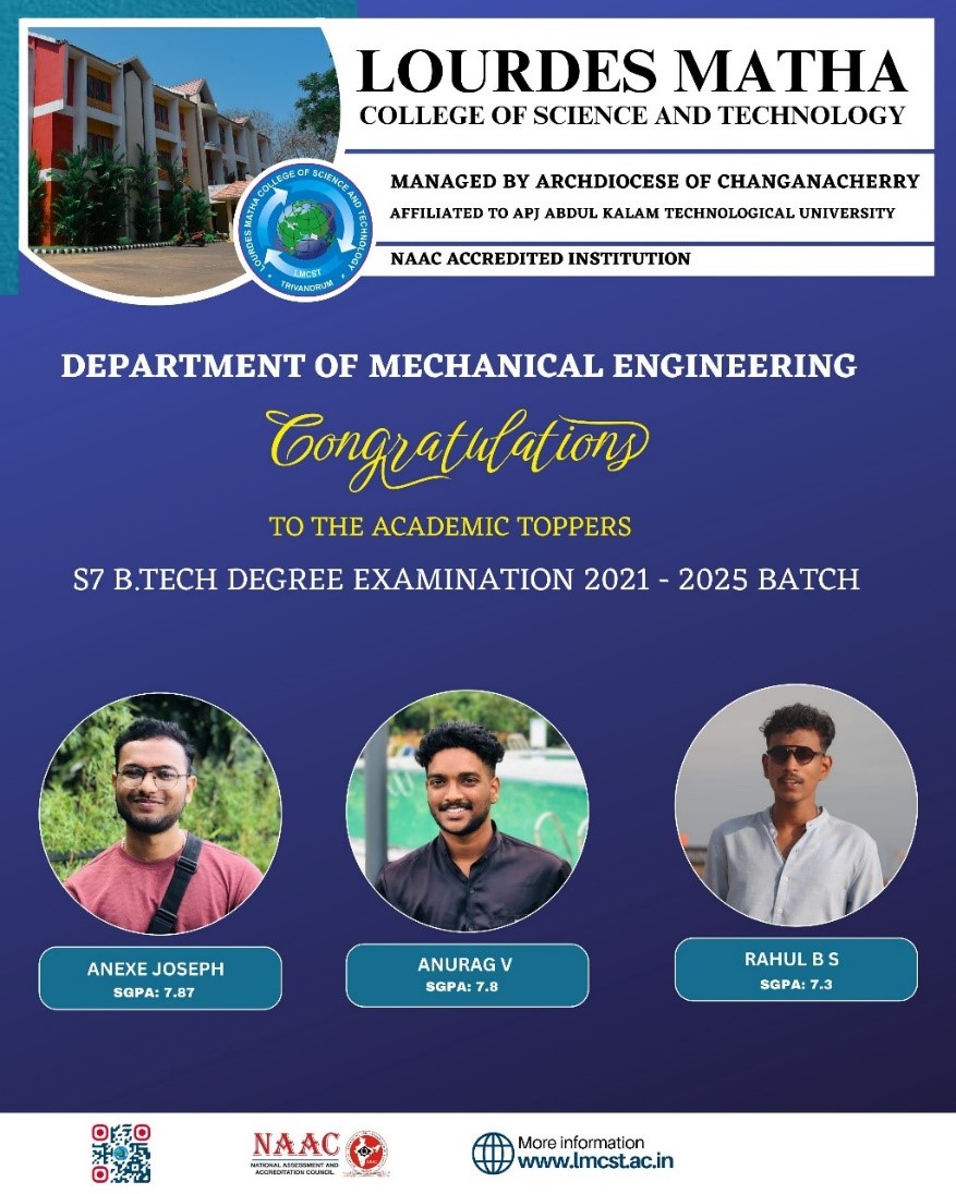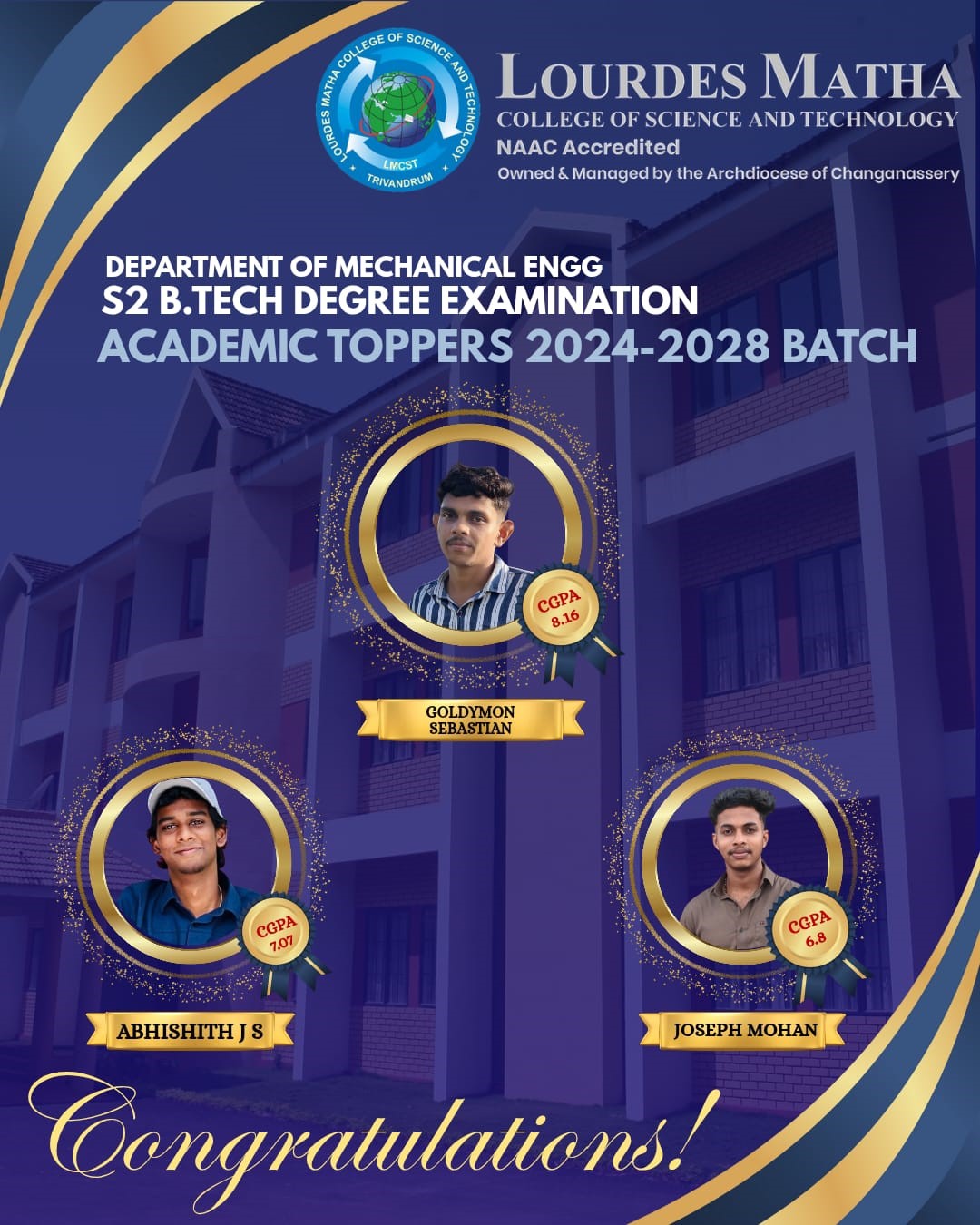 Mechanical Engineering is the most coventional branch of Engineering finding application in all spheres of human activity. Presently it is the most sought-after engineering discipline with respect to career prospects of young Engineering personnel. The Department of Mechanical Engineering of Lourdes Matha College of Engineering and Technology, established in 2005, is specifically oriented towards moulding young engineering students to top class professionals capable of taking up the challenges of the modern day.